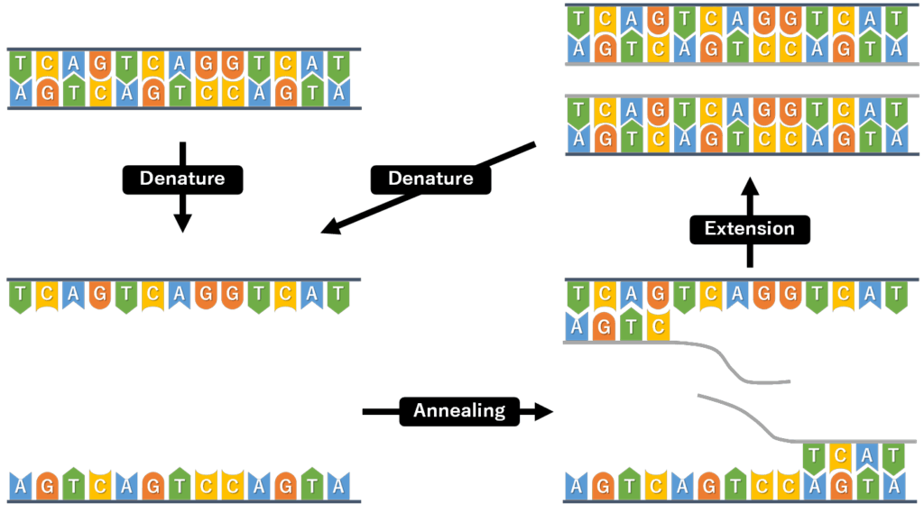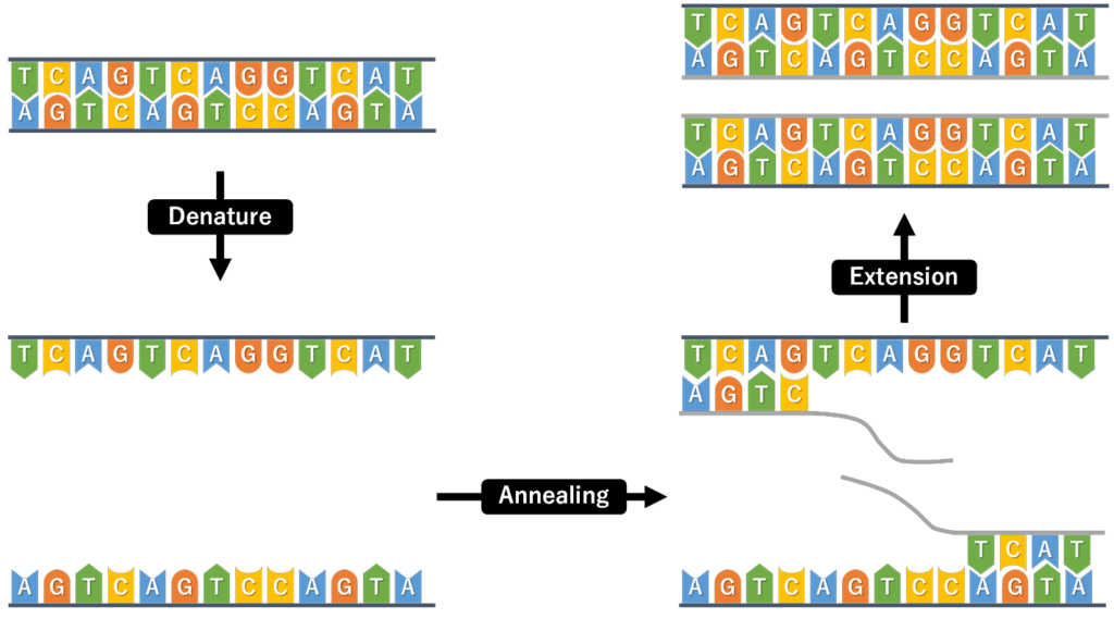 コロナ検査ですっかり有名になったPCRですが、元の鋳型となる遺伝子配列を増幅させていくための技術です。PCRの解説は非常に詳しい教科書がたくさんありますし、大枠は高校生が学ぶ内容になっていますので、詳細を知りたい方は教科書をご覧いただければと思いますが、ここではざっくりと何がどうなっているのかを説明します。