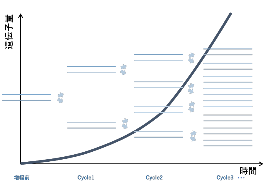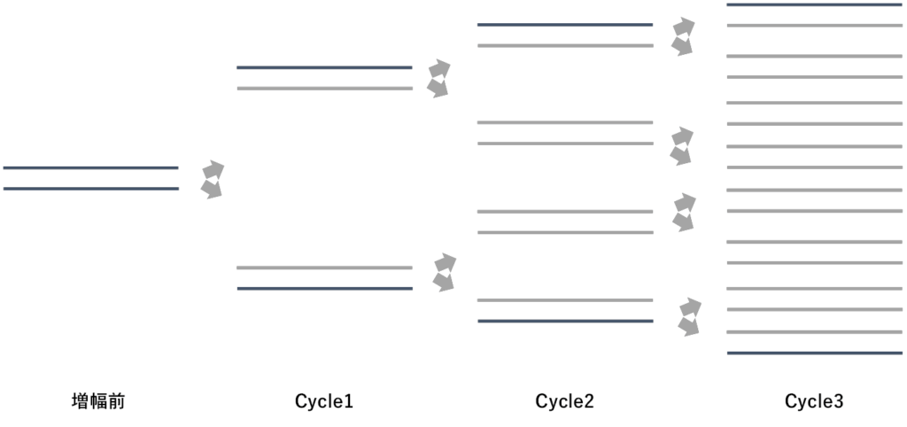 そして、2倍になったDNAは再び温度をかけることで、Denatureを起こしますので、先ほどと同じ順に温度のサイクルを回していくことで、DNAが倍々に増えていきます。(増幅効率が1の場合)