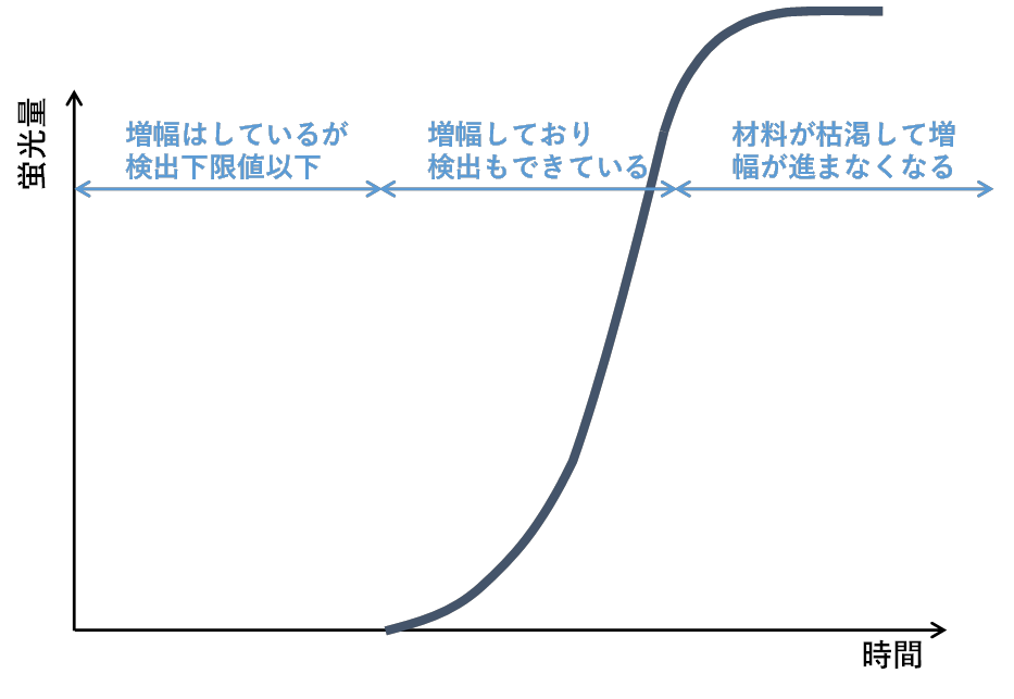リアルタイムPCRで時間を追ってみていくと、遺伝子の増幅によって徐々に蛍光量が増えていき、機器側で検出できるようになります。そしてやがて指数対数的に検出される蛍光量が増えていき、やがて蛍光量の増加がストップします。
