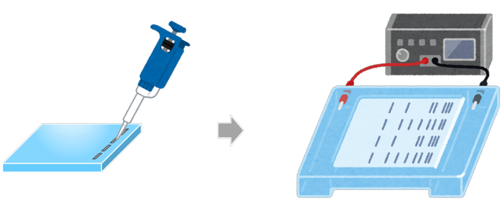 増えた遺伝子を検出するのに最も歴史ある手法は、電気泳動です。増えた遺伝子を含んだ溶液を回収して穴の開いたゲルの中に流し込みます。