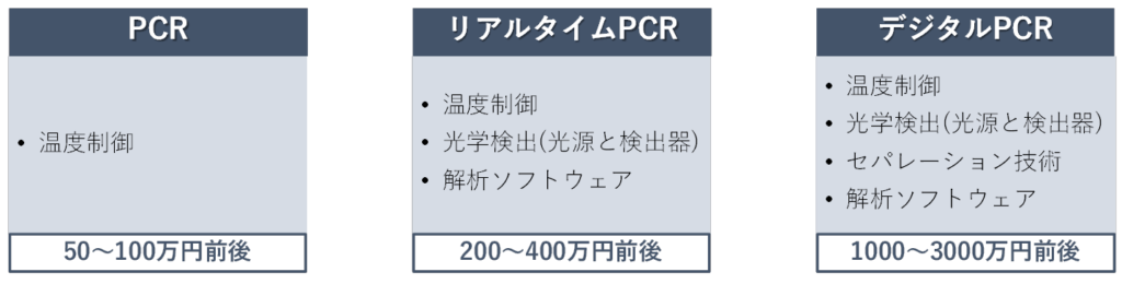 2024年1月現在、PCRを行う装置はPCR(コンベンショナルPCR、エンドポイントPCR)、リアルタイムPCR(=qPCR)、デジタルPCR(=dPCR)がありますが、それぞれ全く異なる価格帯になっています。