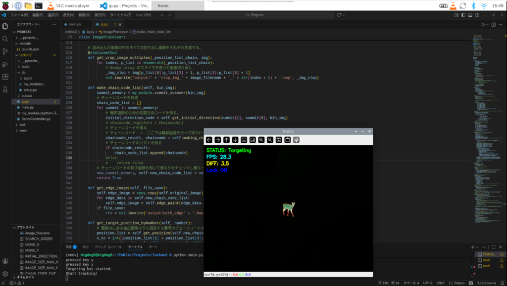常にカメラ画角の中央にシカが来るよう制御しています。下の動画では開始5秒後くらいから画像処理開始し、中心座標とのズレ量を表示しています。(シンボルDIFFのところ)