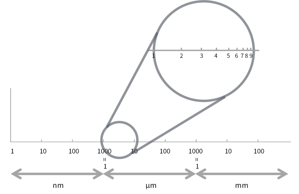 粒度分布では一般的にX軸に対数を用います。 対数表記にすることで、広い分布を1つのグラフで表すことができるようになうので、実際に存在する粒子を評価するのに適していると言えます。